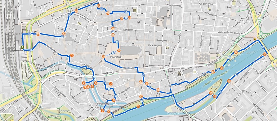 Von unserem Treffpunkt am Hauptbahnhof Ulm aus geht es einmal über die Hirschstraße in die Altstadt Ulm, auf den Münsterplatz und auch an die Donau, wir entdecken alles was es in Ulm so wichtiges
